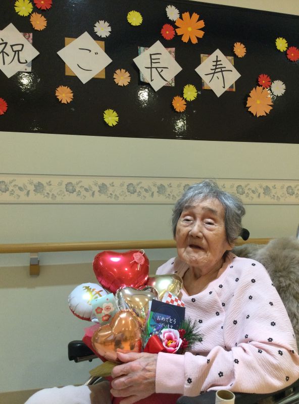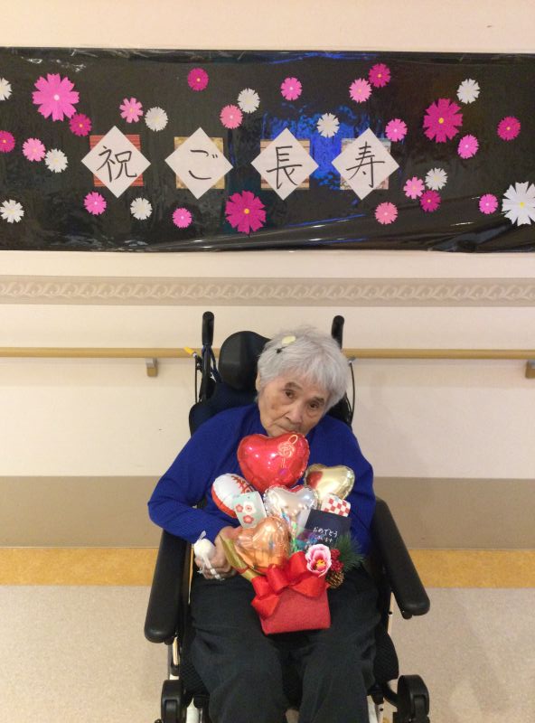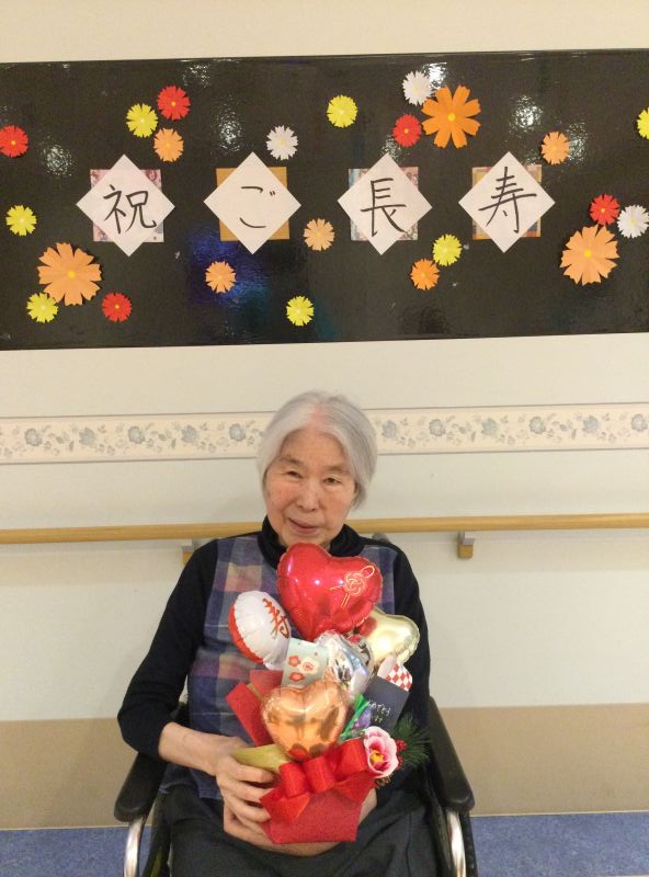 敬老の日に、ユニット職員が手作りした飾りの前で写真撮影を行いました。カラフルな飾りとバルーンを持ち、皆様素敵な笑顔を見せてくれました。入居者の皆様からは「かわいいね」「素敵ね」と歓声があがりました。